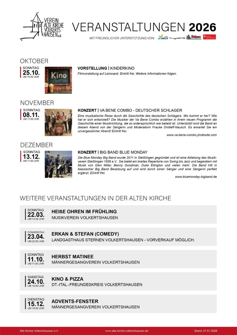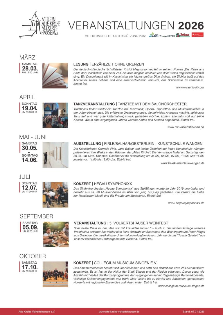 unser Programm-Team hat für das Jahr 2026 wieder eine sorgfältige Auswahl an Ausstellungen, Veranstaltungen & Konzerten zusammengetragen. Wir hoffen, dass auch für Ihren Geschmack etwas dabei ist und wünschen Ihnen bereits heute viel Spaß beim Besuch in unserer Alten Kirche.